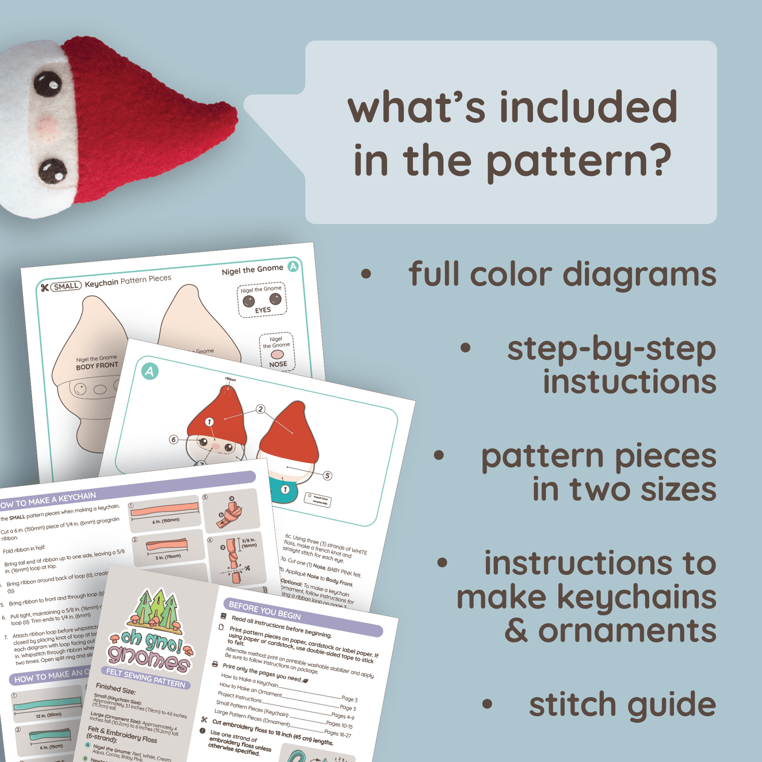 Gno joke—these little guys are gnome-tastic! Sew four whimsical felt gnomes with beards full of character and two felt mushrooms that are absolute fungi to craft. Whether for holiday fun or everyday charm, these gnomes are ready to make your projects magical! Pattern makes two sizes! Make a mini plush, a keychain or an ornament (Instructions included)